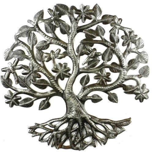 Depicting a Tree of Life, this piece is handcrafted from steel drums in Haiti. It is 14 inches in diameter and suitable for indoor or outdoor use.