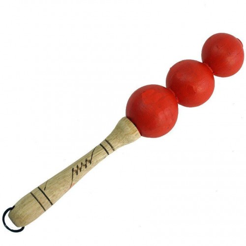 Three nuts make a very precise 'shake'. On a carved stick makes a great addition to a collection. Red color.