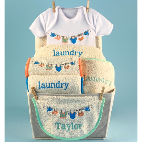 Nothing is sweeter or more appropriate to welcome a new baby then a "Baby Laundry" themed baby basket . This unisex baby gift for either a baby boy or baby girl has much going for it. For starters, it's filled with essential baby boutique quality layette items, each beautifully embroidered with a laundy theme and 100% made in the USA from domestic cotton fabrics. The included baby bib also comes personalized with baby's name to give this unique baby gift it's custom made appearance. Finally, the imported 10" x 12" fabric lined storage basket is decorated with miniature chothes pins and wrapped in tulle (not shown) to make a stunning gift presentation.