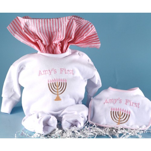 Have baby celebrate her first Festival of Lights in style in this beautiful daywear outfit and bib set. Made from a premium 100% cotton interlock fabric, both items are embroidered with a lovely Menorah and personalized with baby's name. The outfit is available in three sizes and and features a convenient zippered crouch for making diaper changes a breeze. The two-ply bib is edged in a soft pink color to compliment the embroidery design. Make this a memorable first Chanukah for the baby girl in your life!