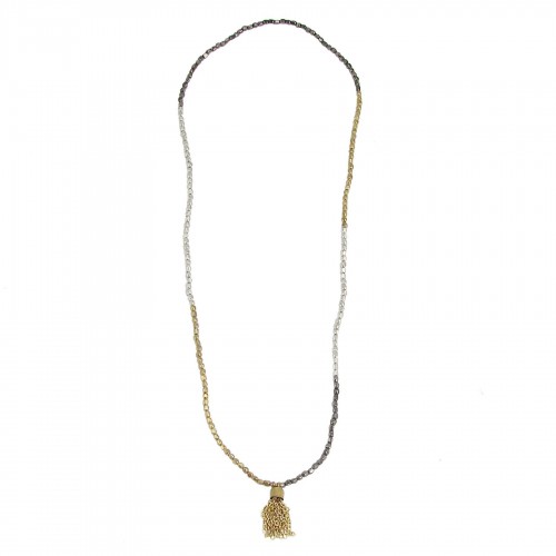 This delicate layering piece features alternating bands of gold, silver, and gunmetal beads and is finished with a tassel of golden chain. It's elasticized and can be worn as a necklace or triple-wrapped as a bracelet. Measures 20 inches.
