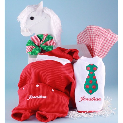 Here'a a gift that will have baby looking his best on Christmas Day. It's our holiday appropriate Christmas Outfit, Santa Hat & Bib baby gift set. The signature piece is a beautuful outfit for baby in a holiday red waffle fabric. The outfit, which is available in three sizes, has such high-end details as a zippered front crouch to make diaper changes easy, a two-piece back with button flap, and name personalization. In addition, the gift set includes a matching santa's cap that will have baby looking fabulous, and a holiday themed pull-over bib that also comes personalization. All of these items are gift wrapped and presented in our most distinctive rocking horse gift box, so this is one gift that will look just as beautiful under the tree as it does on baby.