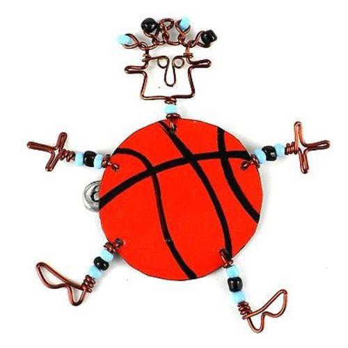 This handmade novelty dancing girl pin features a playful basketball design made from recycled tin can and copper wire, accented with colorful Maasai beads. Pin is approximately 3 inches long.