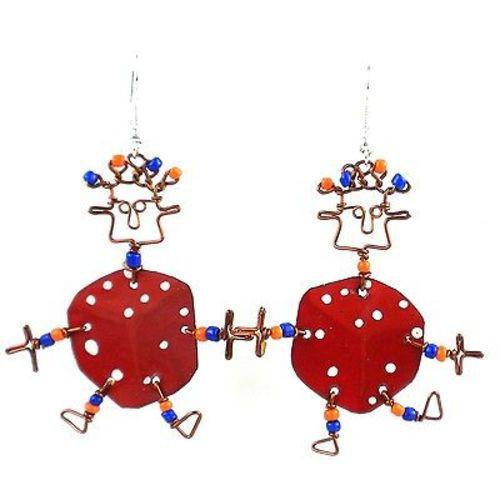 This handmade novelty pair of dancing girl earrings features a playful lucky dice design made from recycled tin can and copper wire, accented with colorful Maasai beads. Earrings hang approximately 1.75 inches.