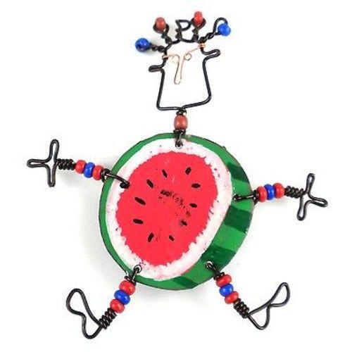 This handmade novelty dancing girl pin features a playful round melon design made from recycled tin can and copper wire, accented with colorful Maasai beads. Pin is approximately 3 inches tall.