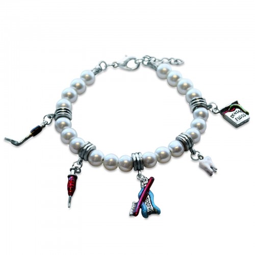 The perfect gift for any Dentist or Dental Assistant. Give that special Dentist or Dental Assistant a gift they will remember with this colorful dental themed charm bracelet. Whether you prefer gold or silver, this dental themed charm bracelet will coordinate with your favorite Whimsical Watches, Whimsical Earrings or Whimsical Necklaces. It fastens with a lobster-claw clasp for easy on and off. 6" length expandable to 9". Beautiful glass beads, stainless steel spacers, sterling silver and gold plated chain make for quality, style and colorful statement for any occasion!