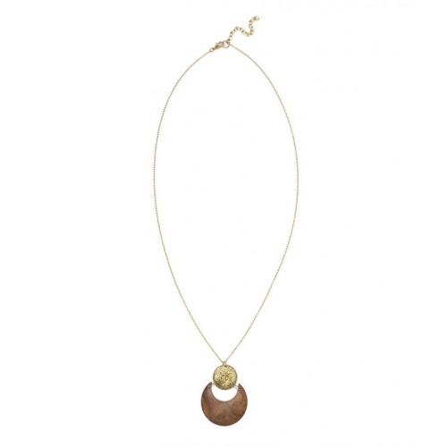 This long pendant necklace has two pieces - a brilliant, golden brass rounded full moon medallion etched with a floral design, connected to a wooden waning moon shape on a brass 30-inch chain.