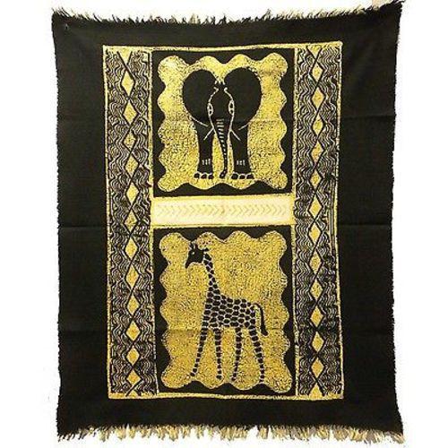 Batiked and painted by hand, this vertically-oriented barkweave cotton wall hanging features an elephant and giraffe. It measures 29.5 by 39 inches (75cm X 1 M).