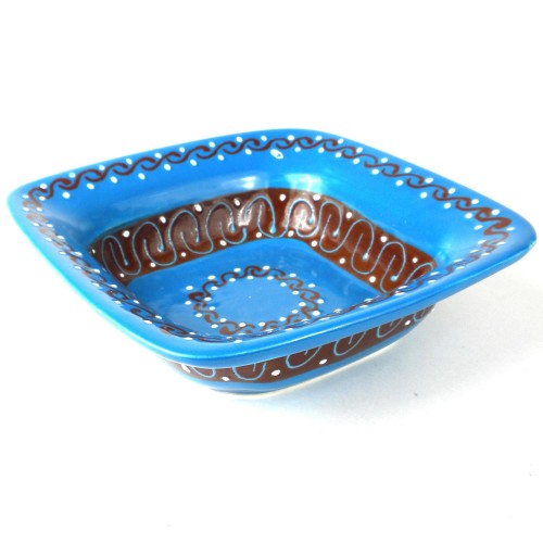 Lead-free, dishwasher and microwave safe, this richly-colored serving bowl with flared sides is handcrafted and painted by Mexican artisans. While a very functional piece, the inside and outside is covered with a textured pattern making each piece unique. The 8-inch square bowl is 2.5 inches deep.