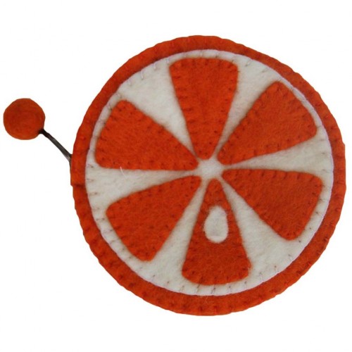 This felt coin purse features a slice of orange. Measures 5.5 inches in diameter.