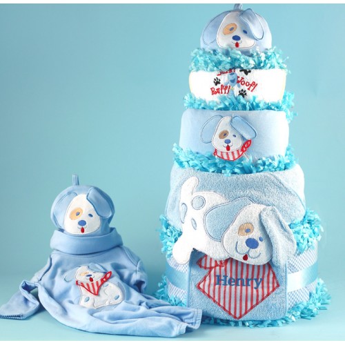 Our new Puppy Love Diaper Cake is very sweet indeed. This adorable puppy themed baby gift stands an impressive 24" tall, includes both diapers and quality layette items, and in this particular version comes personalized with baby's name embroidered on the bandana washcloth for that extra special touch. Each Puppy Love Diaper Cake is individually made to order and delivered elegantly gift wrapped in tulle.