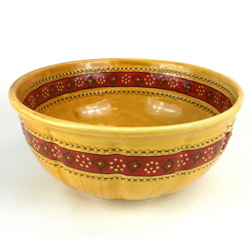Eleven and a half inches in diameter, lead-free, dishwasher and microwave safe, this richly-colored bowl is handcrafted and painted by Mexican artisans. While a very functional piece, the inside and outside of this 4-inch tall bowl is covered with a textured pattern making each piece unique.