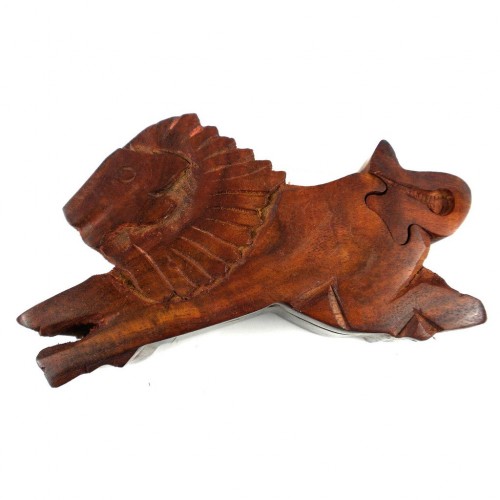 Whimsical and handsome, this hand-carved puzzle box adds character to a room while hiding small objects, jewelry and loose change. Measures 6.5 by 3.75 inches.