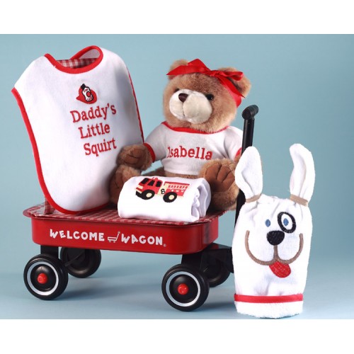 Daddy's "Little Squirt" is the perfect baby gift to welcome the newest firehouse recruit. What could be more approriate than our fire engine red Welcome Wagon filled with adorable fireman themed layette essentials for baby, including a personalized teddy bear with baby's name. This unique baby gift for baby girl comes with: