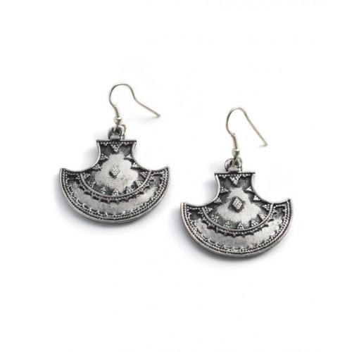 Convex shaped silver metal earrings with intricate, traditional, embossed design named for India's famous warrior queen. Matches the Maratha Queen Ring. measures 1.25 by 1 inch.