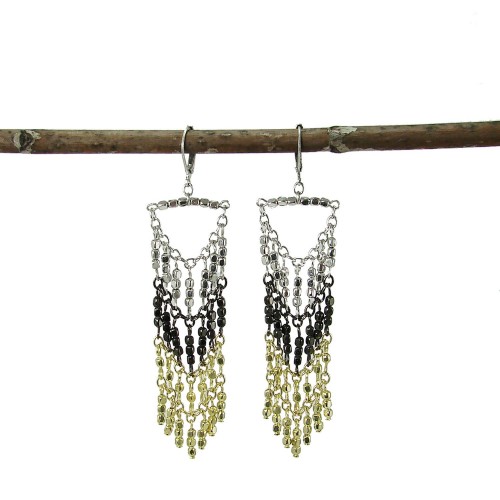 Rows of gold, silver, and gunmetal beads hang from a beaded bar to form a shimmering chevron of mixed metals in these bold earrings. Finished with hinged earring backs. Measures 3.5 inches long.