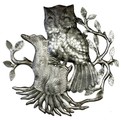 This piece features a single owl on a perch design in this traditional Haitian design. Hand cut and embossed, this piece is 23 inches in diameter.