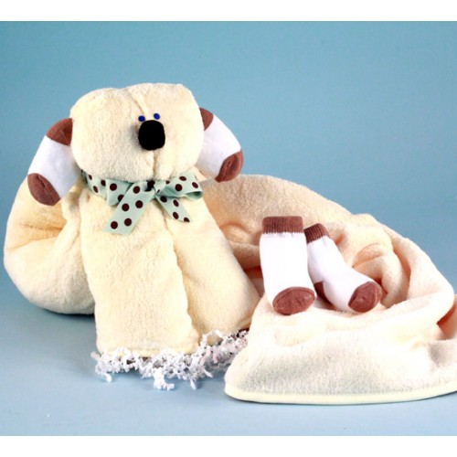 Ever baby needs a favorite baby blanket, and here's one that's as cute as a puppy. It's our soft and cuddly "milky" fabric baby blanket, beautifully done in a warm pastel yellow with matching trim. The neutral colors makes this baby gift appropriate for either a baby boy or baby girl, and a perfect gift to bring to a baby shower. The blanket is proudly manufactured by this baby's best friend. A pair of socks is included to keep baby especially warm and toasty.