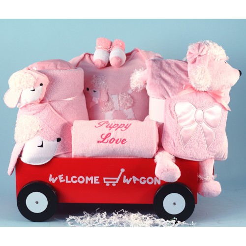 Everyone will fall in love with this stylish and sophisticated poodle themed baby gift for the newborn baby girl. It begins with our deluxe Welcome Wagon™, which makes a great toy as baby grows and is large enough for an infant to sit in with parental supervision. Next we add a coordinated group of the most adorable poodle appliqued layette items that the new mother will flip over. Finally, all of these goodies are artfully put together as you see in the photo, then exquisitively wrapped in tulle and ribbon to make this a stunning and impressive gift. Each Puppy Love Welcome Wagon™ is proudly custom assembled by our team of gift professionals in Brooklyn, USA.