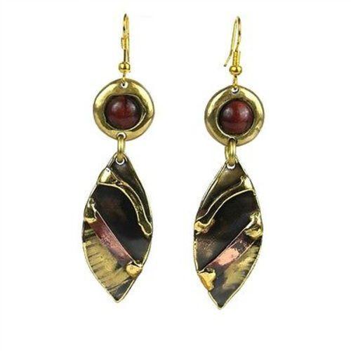 Handworked by South African artisans, these leaf-shaped brass and copper earrings hang from brass hooks and are accented with red tiger eye stones. The earrings are 2.25 inches long.