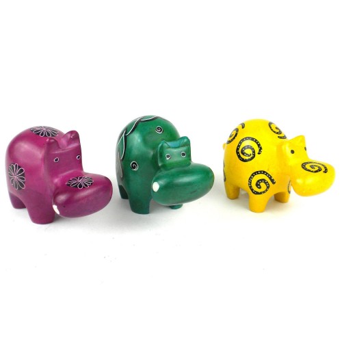 Soapstone is mined from great pits in the area surrounding Kiisi, Kenya. The mined soapstone is then delivered to carvers who carve sculptures from the natural stone for the wholesale market, the color of which ranges from cream, to pink, to brown, to yellow, to black, to a marbling of all of them. Once carved, the craftspeople smooth rough edges of the soapstone with sandpaper dipped in water and polish the piece to a high gloss or paint African motifs in brilliant colors with etched accents.
