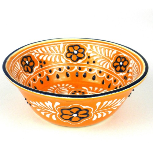 Five inches in diameter at the top, lead-free, dishwasher and microwave safe, this richly-colored bowl is handcrafted and painted by Mexican artisans. While a very functional piece, the inside and outside is covered with a textured pattern making each piece unique.