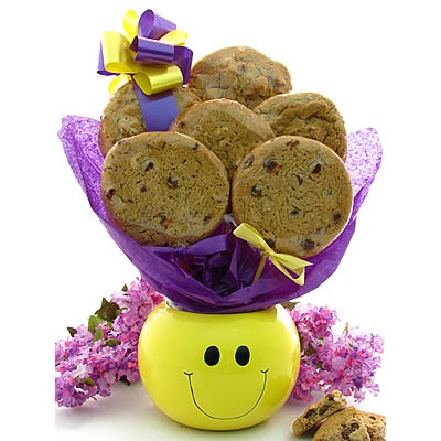 Don't worry, be happy! Who could not smile when they see this adorable smiley face cookie bouquet pot. Brighten up someones day and make them smile with this wonderful cookie bouquet. Stands 5" tall and is made of ceramic. Each of our cookie gifts is two gifts in one; scrumptious gourmet cookies and a keepsake container. Order now and make someone happy!