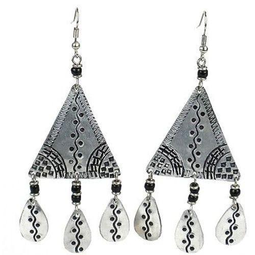 Handmade in Kenya, these earrings are hand-stamped and cut from aluminum that has been recycled from cooking pots. The earrings hang 2.5 inches from hypoallergenic hooks.