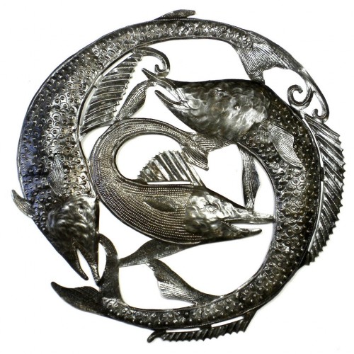 This piece features a three sword fish swimming in this traditional Haitian design. Hand cut and embossed, this piece is 23 inches in diameter.