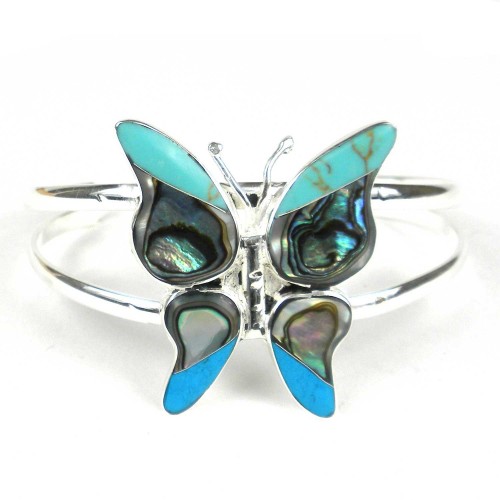 This bracelet is handcast in Mexican alpaca silver and features a 1.5 inch long polished turquoise and abalone butterfly design. Sized Small.