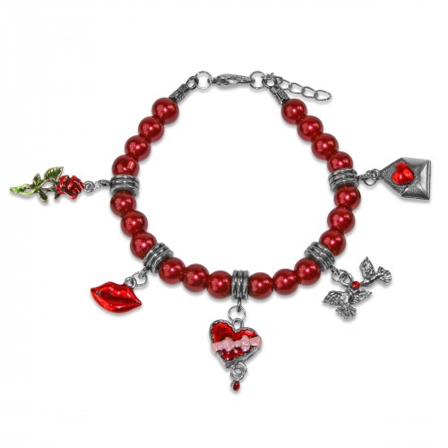 The perfect gift for Valentine's Day. Give that special someone a real cute, colorful Valentine's Day charm bracelet. Whether you prefer gold or silver, this charming Valentine's Day bracelet will coordinate with your favorite Whimsical Watches, Whimsical Earrings or Whimsical Necklaces. It fastens with a lobster-claw clasp for easy on and off. 6" length expandable to 9". Beautiful glass beads, stainless steel spacers, sterling silver and gold plated chain make for quality, style and colorful statement for any occasion!
